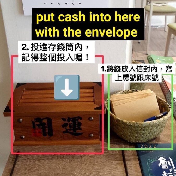 支払い方法もユニーク。備え付けの封筒に部屋番号を書いて現金を入れ、賽銭箱のようなボックスに投入する。450NTD(約2,250円)を投入!