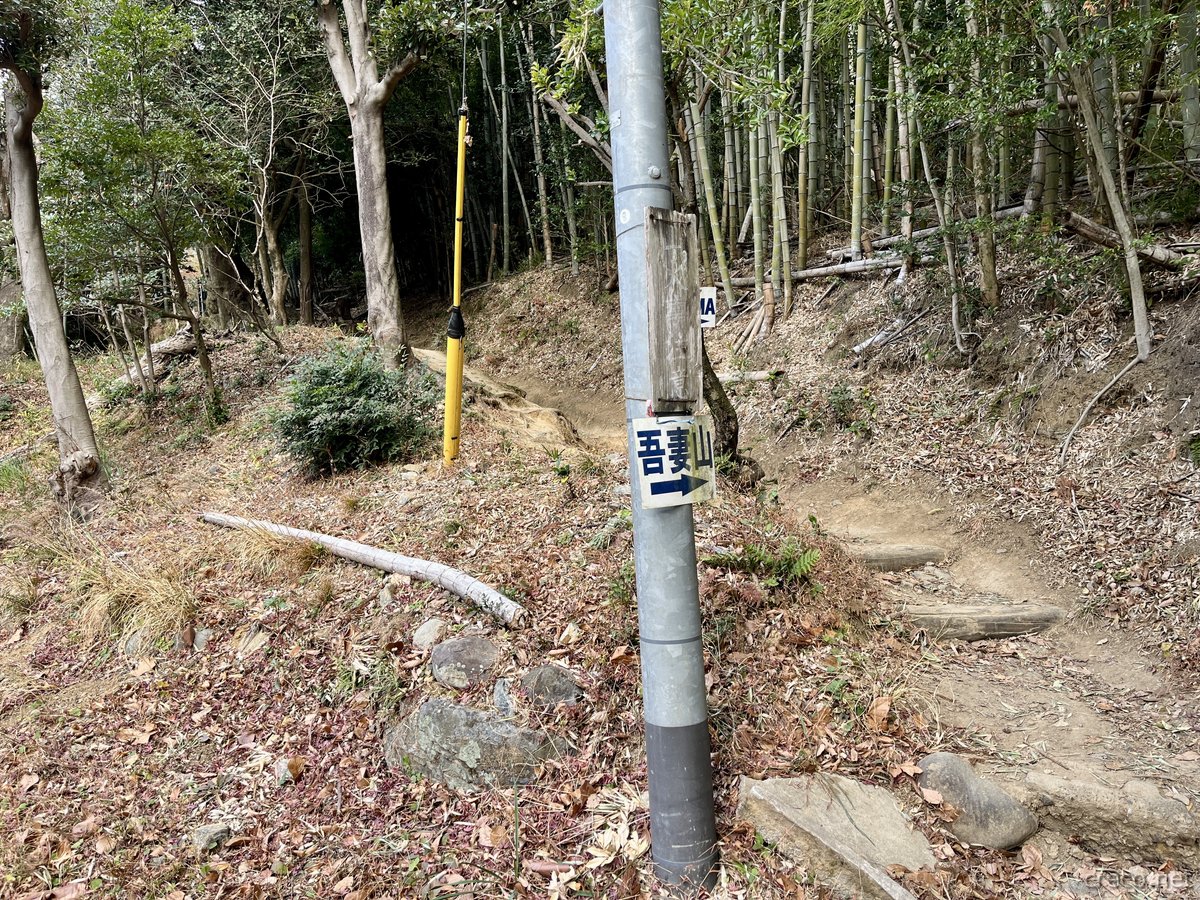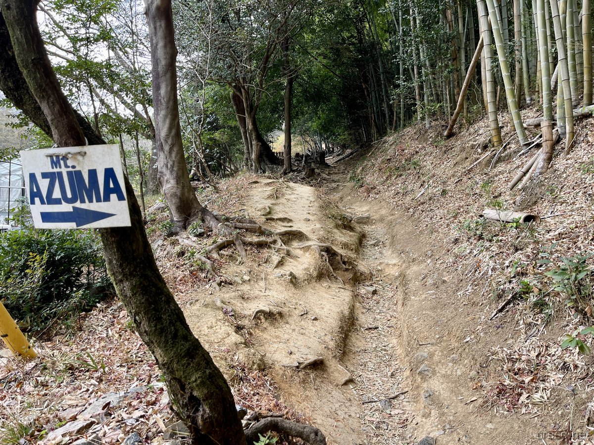 吾妻公園の駐車場に自転車を置いて、ここから徒歩に切り替え登山開始。