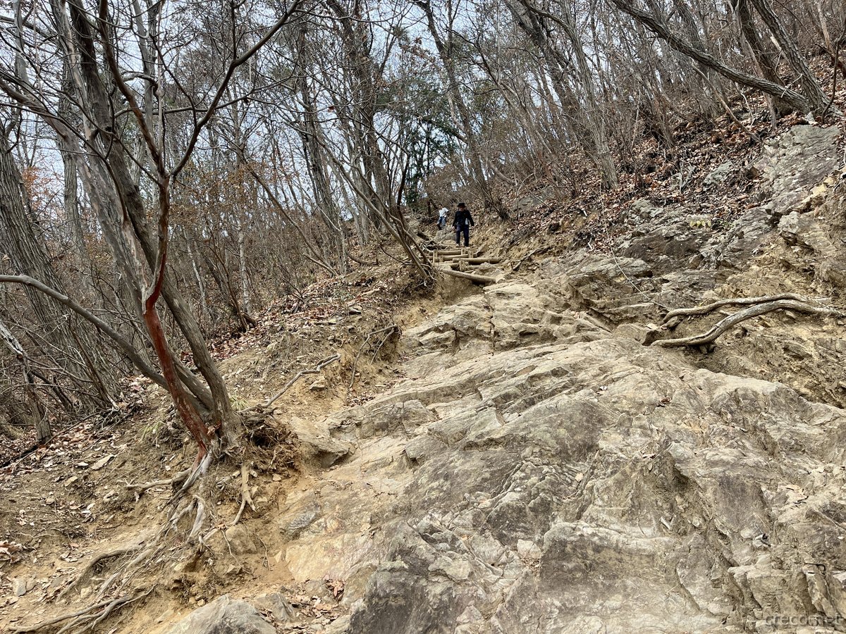 • 低山ながら急斜面: ロープや鎖が設置されたゴツゴツした岩場もあり、変化に富んでいる